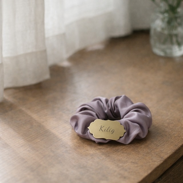 こちらは【Original line】のシュシュです。 やわらかな光になじむ、 落ち着いたニュアンスカラーのシュシュ。 甘くなりすぎない色味と程よいボリューム感で、 大人の女性の装いに自然と溶け込むデザインに仕上げました。 ゴールドのKiligプレートがさりげないアクセントとなり、 まとめ髪はもちろん、手首につけても上品な印象に。 日常使いから、少し気分を上げたい日まで、 幅広くお使いいただけます。 素材:ポリエステル(プレート部分:金属) サイズ:直径 約〇cm ※一点一点手作業で制作しているため、 形や風合いに若干の個体差がございます。 ※強い力を加えると破損の原因となる場合がございます。